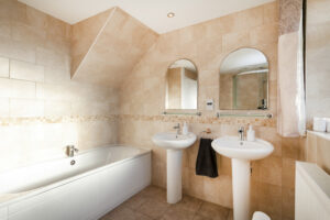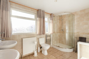 - Main bathroom with an oversized bath, large shower enclosure and twin sinks